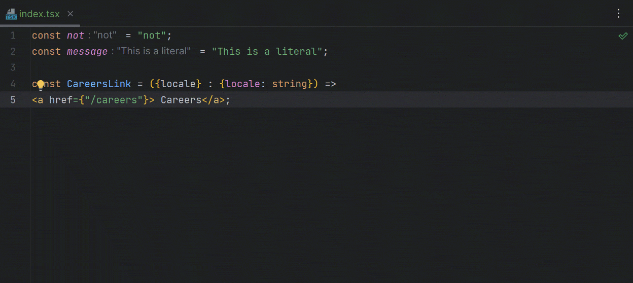 现在只要你输入${,WebStorm就会自动将你的单引号或双引号字符串转换成模板字面。这对原始字符串和JSX属性都有效。