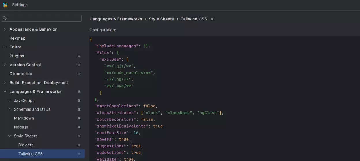 在这个版本中,我们增加了对配置选项的支持,比如在classAttributes选项下的自定义类名完成,或者像tailwindCSS.experimental.configFile这样的实验性选项。你可以在首选项/设置|语言与框架|样式表|Tailwind CSS中设置这些配置选项。