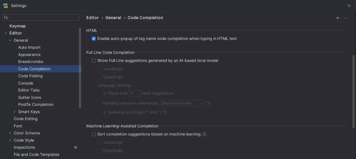 WebStorm 2021.3引入了HTML代码补全功能,当你输入时,会显示标签名称或缩写。在HTML中输入纯文本时,这种行为可能会让人分心,所以我们增加了一个选项来禁用它。你可以在首选项/设置|编辑器|常规|代码完成中找到这个新选项。