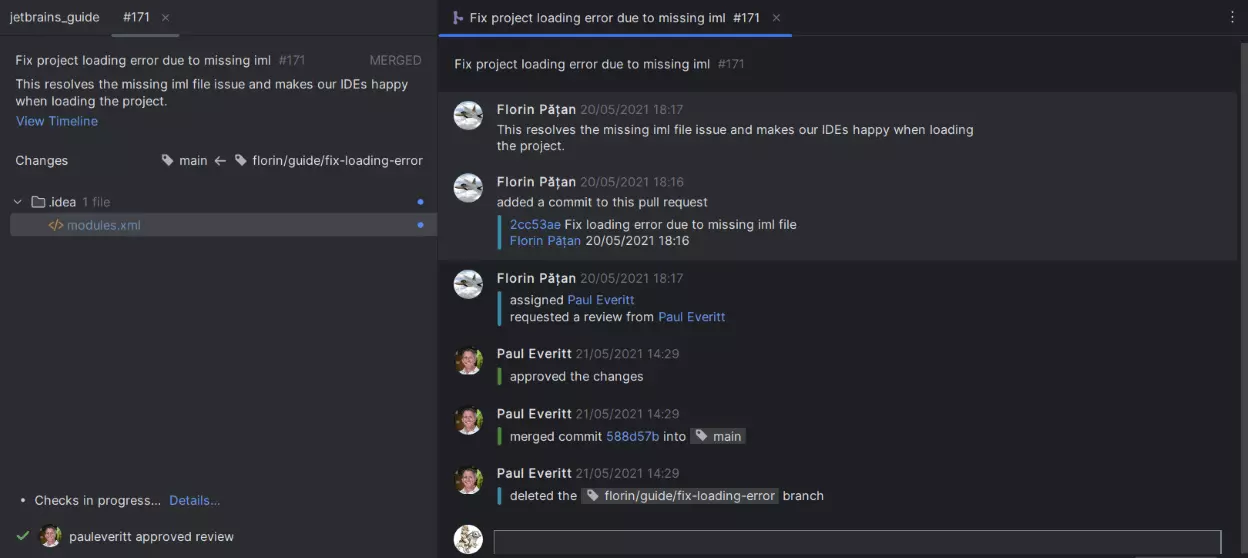 为了简化IDE内的代码审查过程,我们重新设计了拉动请求工具窗口。现在它为你打开的每个拉动请求提供了一个专门的标签。该选项卡会立即显示更改的文件列表,并有一个专门的按钮来根据拉动请求的当前状态执行最相关的操作。