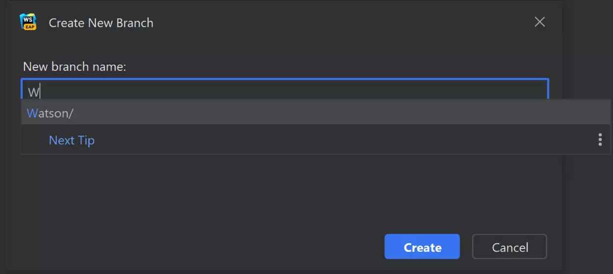 在WebStorm 2023.1中,我们已经在创建新分支的弹出窗口中实现了自动完成。一旦你开始为你的新分支键入一个名字,IDE会根据现有的本地分支的名称建议相关的前缀。