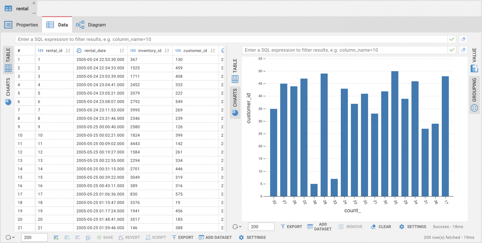 DBeaver 通常用于执行各种分析任务。因此,我们决定在 CloudBeaver 和 Team Edition 的网页版中添加分组面板。它现在可在数据编辑器和数据集中使用。但这还不是全部:我们还添加了使用条形图可视化数据的功能。