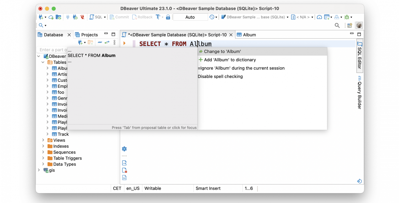 如果您错过了 SQL 编辑器中的拼写检查,我们有个好消息给您。新功能将通过突出显示并建议替换选项来帮助您快速修复脚本中的错误和拼写错误。我们已在字典中包含所有数据类型和 SQL 关键字,因此这项新功能适用于您的任何查询。