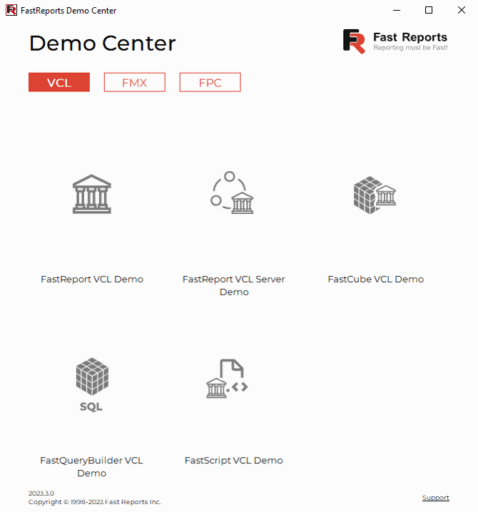 为方便起见,我们将所有演示合并到一个演示中心。它可与新的 FastReport 产品安装程序一起使用。