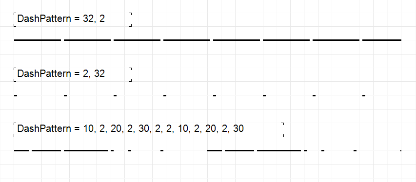 对于 LineObject、ShapeObject、PolyLineObject 和 PolygonObject 对象,已添加了一个新属性--DashPattern,允许您创建自己的线条样式。以前,这些对象的线条样式是通过 Border.LineStyle 属性设置的。只有六种样式可用:实线、虚线、点线、虚点线、虚点线和双线。使用新属性,您可以指定一系列值,这些值将按顺序指定笔画和空格的长度。
