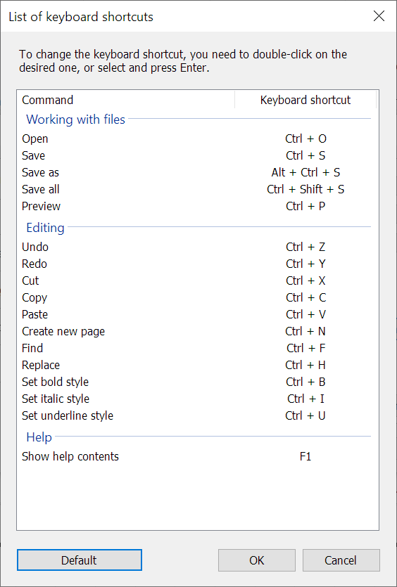 上面的表格列出了操作及其指定的键盘快捷键。双击所需行即可更改组合。您还可以使用向上键和向下键浏览表格,并按回车键进行更改。您也可以将所有组合恢复为默认值。