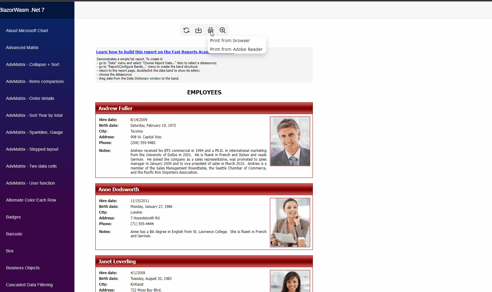WebReport 现在允许您在 Blazor WebAssembly 中打印报告。该功能默认已启用,但如果需要禁用,只需使用以下代码即可: