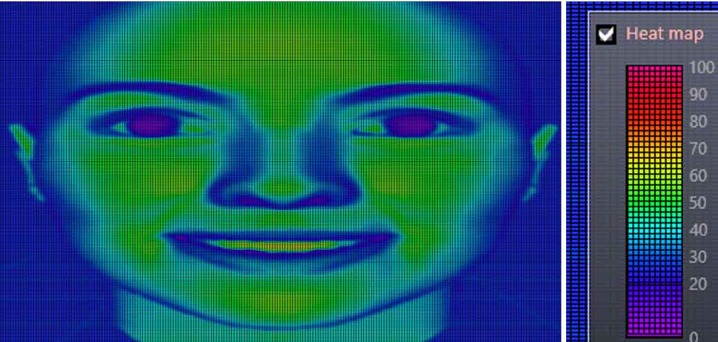 例如,我们可以通过观察强烈的肤色来识别人脸温度最高的区域。 在下图中,我们可以注意到面部最热的区域在40-50摄氏度之间(这对于人类来说相当高,但可以说这是出于演示目的可以接受的范围),而最冷的区域 均在30摄氏度之间。