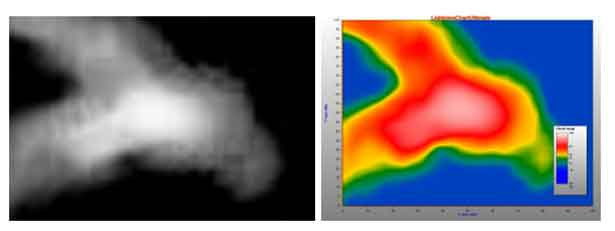 最高的值将具有红色,最低的值将具有紫色。 对于此示例,强度范围内的值与图像中每个像素的颜色强度成比例。 如果您上传黑色背景的图像,它将在热图中显示紫色,因为它是强度范围内最暗的颜色。
