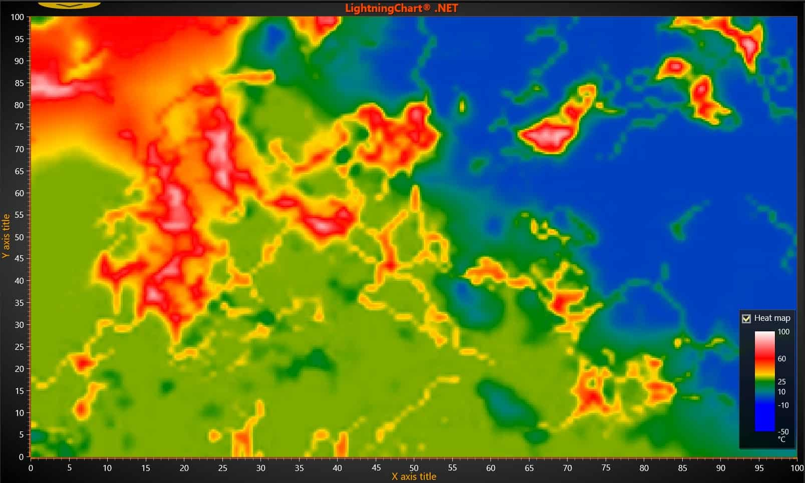 此 WPF 2D 热图将使用 IntensityGridSeries 创建。 您还可以通过 LightningChart .NET 交互式示例应用程序访问此图表。