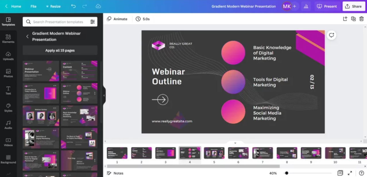 Canva Presentation 允许用户轻松整合多媒体元素,包括图像、图标、视频和插图,以创建具有视觉吸引力的演示文稿。它提供丰富的自定义选项,允许用户更改颜色、字体和布局,以符合自己的品牌或个人喜好。此外,它还具有动画和过渡功能,可以为幻灯片添加动态元素。品牌工具包功能允许用户在所有演示文稿中创建一致的品牌标识。这包括保存品牌颜色、徽标和字体,以便于访问。