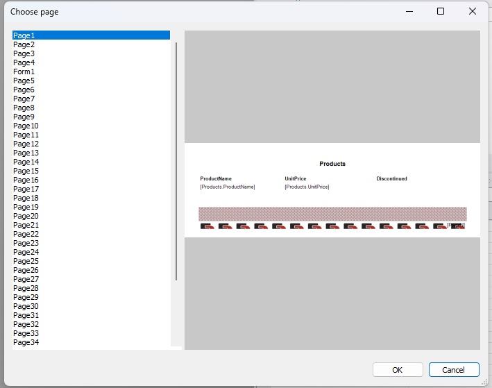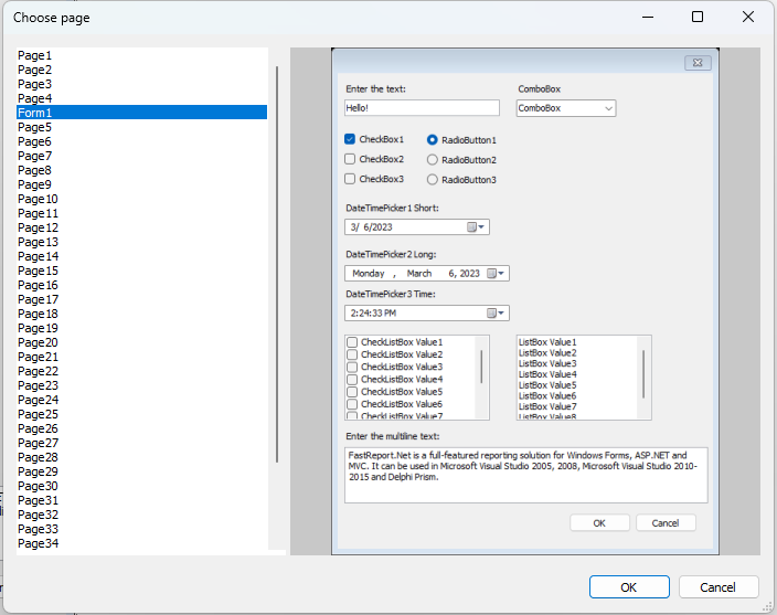 您将看到一个文件选择对话框,类似于以常规方式加载报告时的对话框。选择后,您将看到一个窗口,其中包含所有报告页面的列表、对话框窗体以及所选页面的预览。页面的显示方式与设计器中相同。从列表中更改页面选择时,预览也会随之改变。