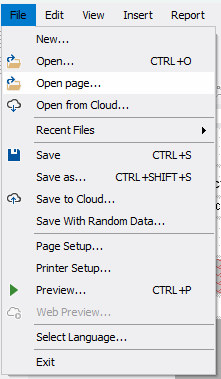 FastReport .NET 的最新更新允许您将其他报告中的页面添加到已开发的报告中。这将帮助您更快地处理报告。在此之前,您需要合并多个文件或手动重做报告。要添加页面,请打开 "文件 "菜单并选择 "打开页面"。