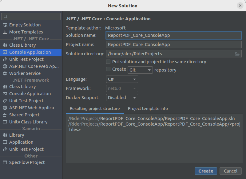 下一步是设置项目。在 .NET/.NET Core 部分选择控制台应用程序项目类型。然后为项目命名,例如使用 "ReportPDF_Core_ConsoleApp"。点击 "控制台应用程序类型"、"C# 语言"、".NET 6.0 框架 "之后,我们将看到 "控制台应用程序 "项目。