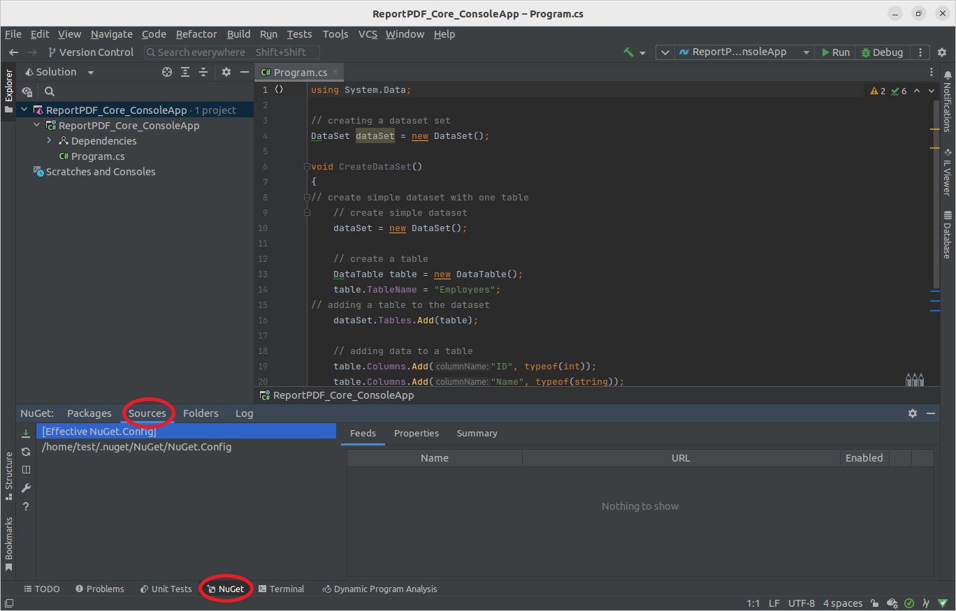 本文将介绍如何在购买FastReport .NET后添加NuGet包。下面是一个简短的说明,以免您需要搜索另一篇文章。点击 IDE 底部的 NuGet 选项卡,然后点击 Sources 选项卡。