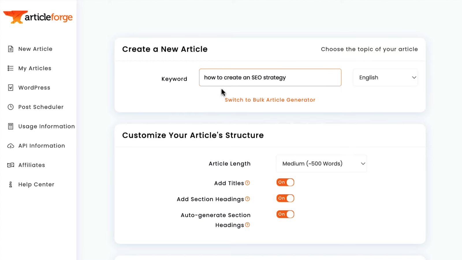 Article Forge 是一款用于创建长篇内容的人工智能写作软件。输入关键字,选择长度等基本参数,Article Forge 就会创建新内容。