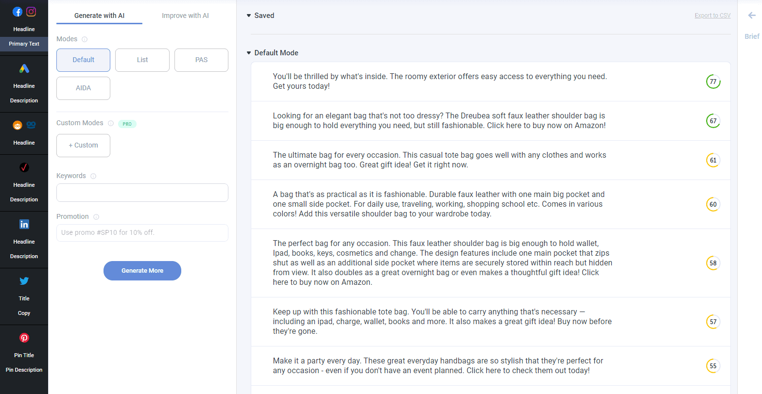 它的主要优势在于社交媒体文章。Writesonic 对信息的要求很低,只需提供简要说明(50 个字即可)。然后,程序会根据您选择的类别(Instagram 帖子、博客文章等)生成多种不同的内容。如果是与季节、活动或特定产品相关的内容,这种方法效果会很好。