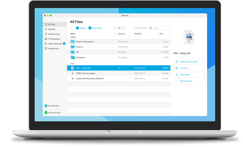 为了提供最高级别的安全性,Tresorit 为文件共享和同步使用集成的端到端加密,符合 HIPAA、GDPR、CCPA 和 ISO 27001 认证。