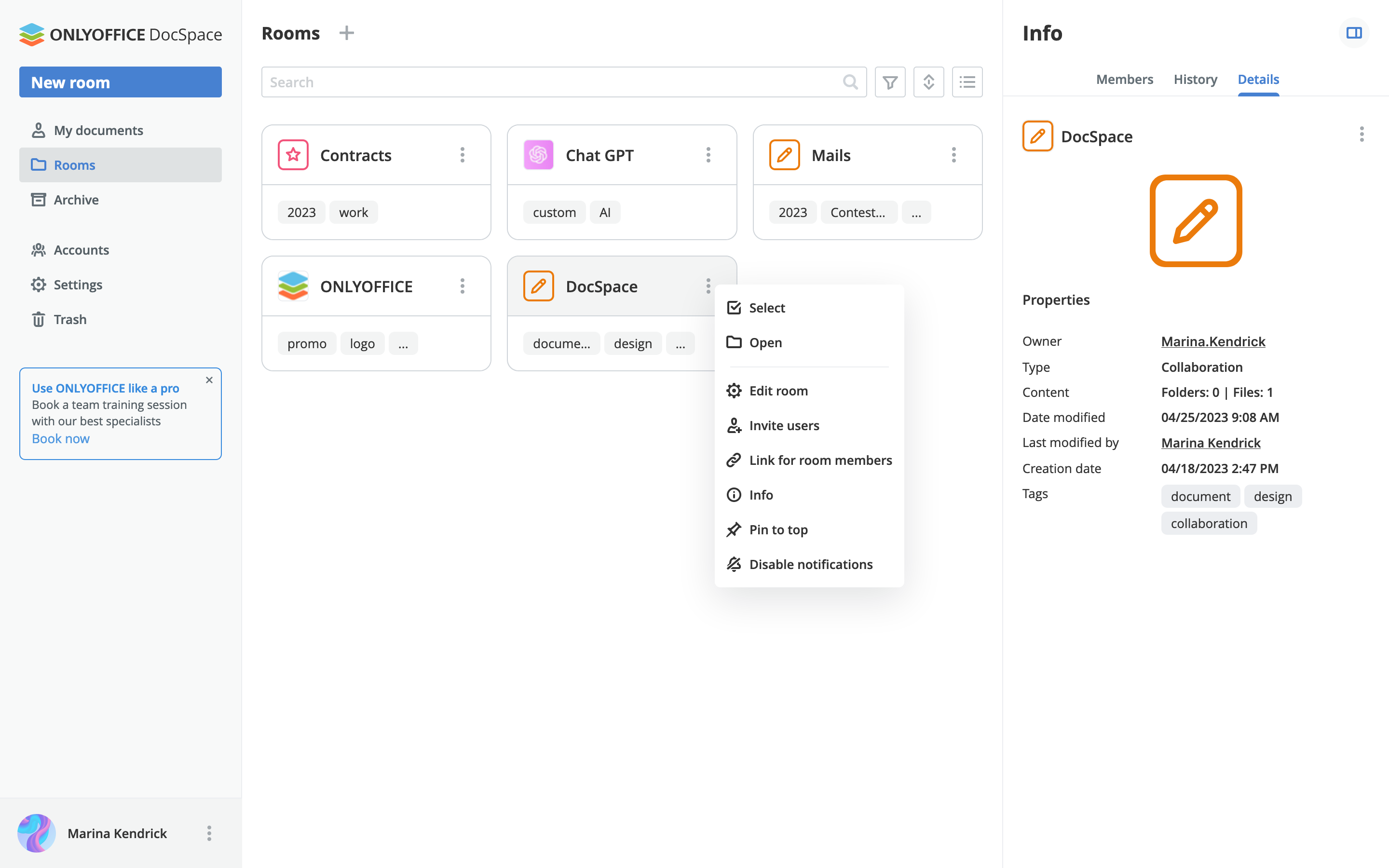 真实案例:ONLYOFFICE DocSpace 的用户界面既现代又直观,新用户可以轻松上手。所有主要部分都位于左侧,附加窗口位于右侧。DocSpace 界面没有过多的元素,因此更容易在所需功能之间进行导航。