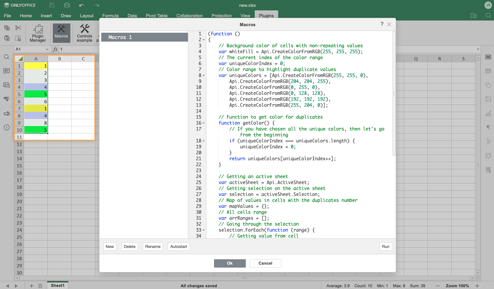 同样的任务可以通过 ONLYOFFICE JavaScript 宏来完成,甚至只需使用更少的代码行:
