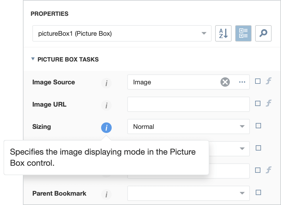 我们的 Web 报告设计器组件现在会显示带有属性描述的提示(当用户将鼠标悬停在属性编辑器左侧的信息符号 (i) 上时)。这一改进可以让用户更好地了解给定属性的用途。
