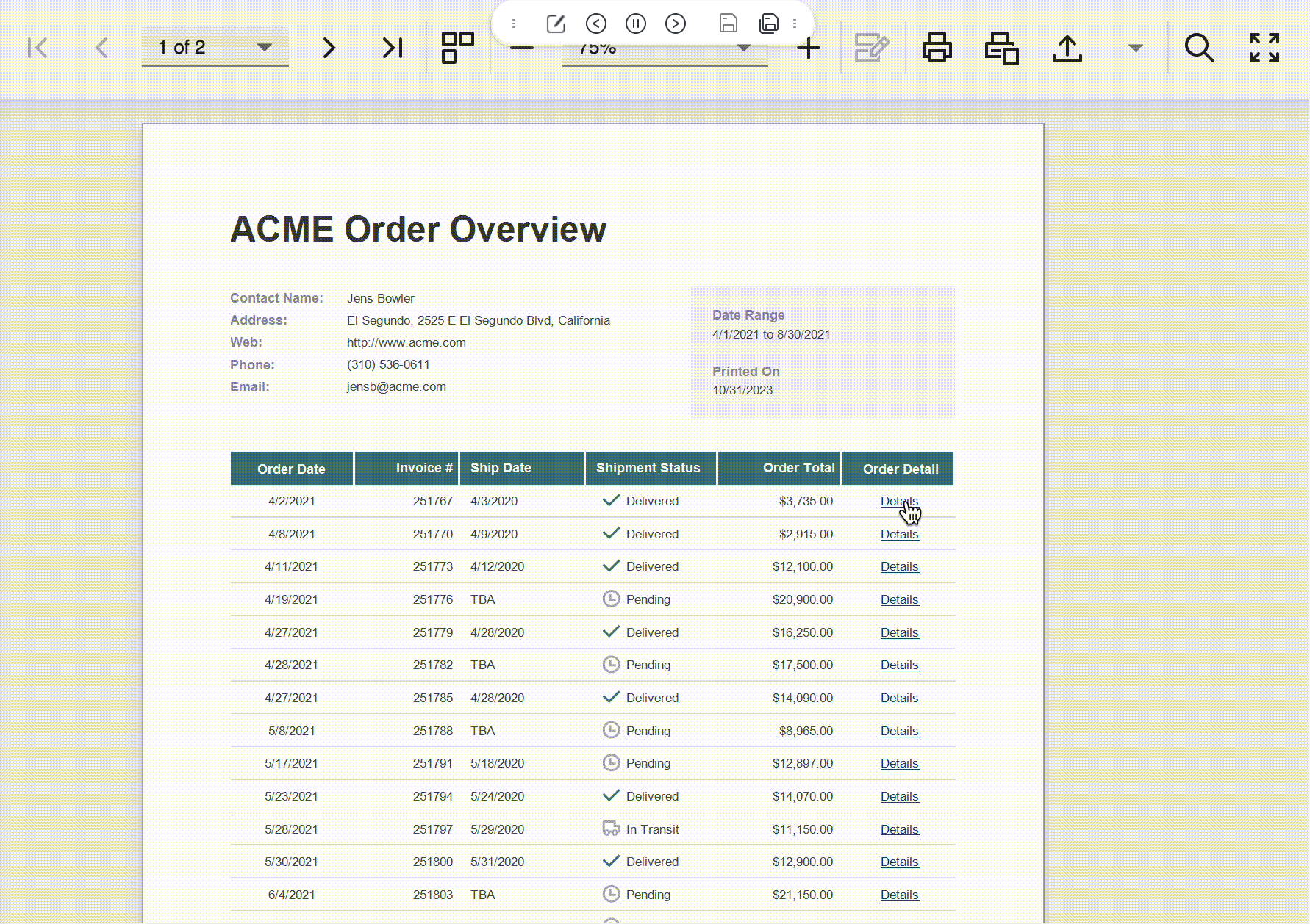 现在,您可以为所有支持的平台创建穿透式报告。通过钻取功能,您可以在同一打印预览窗口中单击报告元素并导航到详细报告。