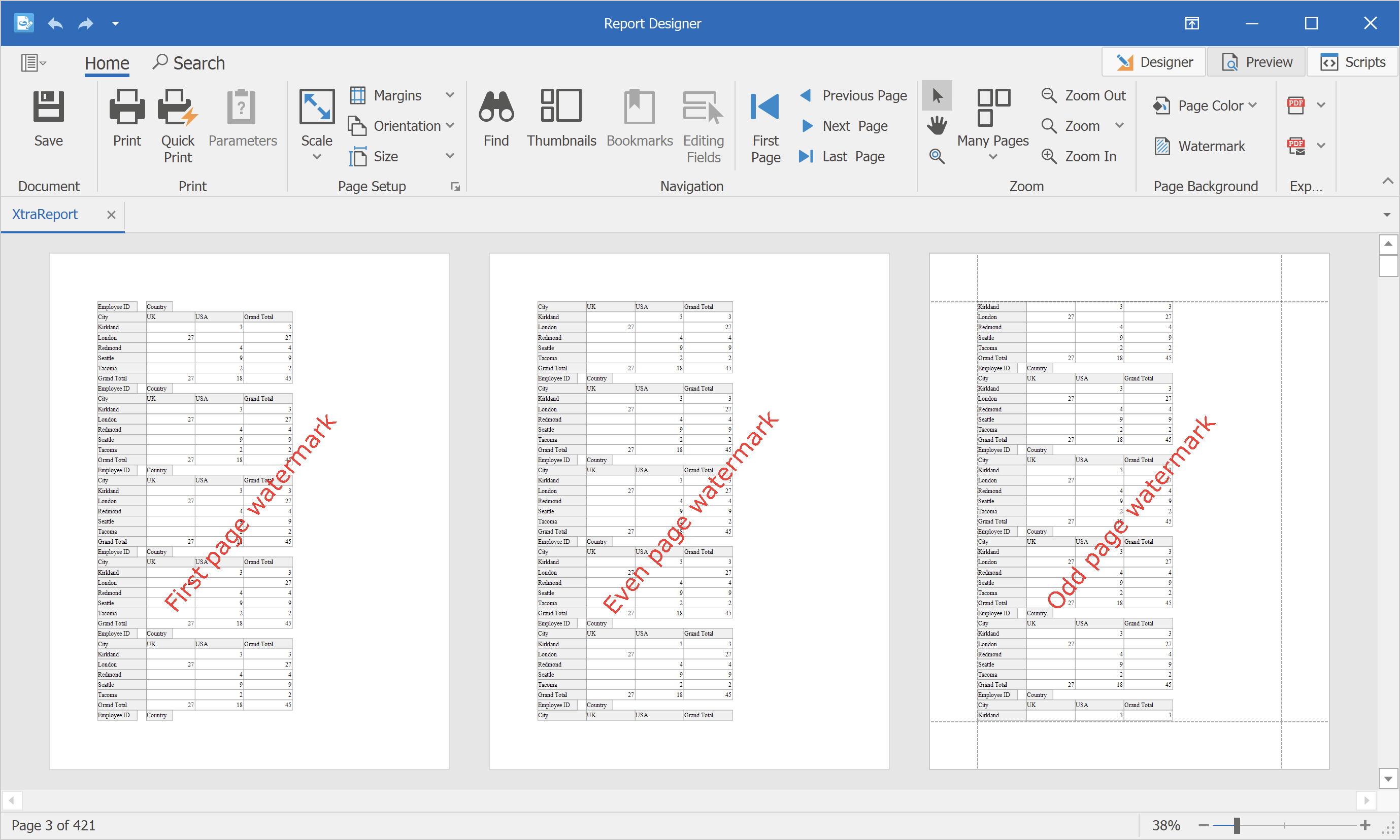 XtraReport 类包含一个水印集合属性。将 XtraReport.WatermarkId 属性绑定到表达式,可将水印应用到特定的报告页面。使用下面的表达式可为报告的奇数页和偶数页添加不同的水印: