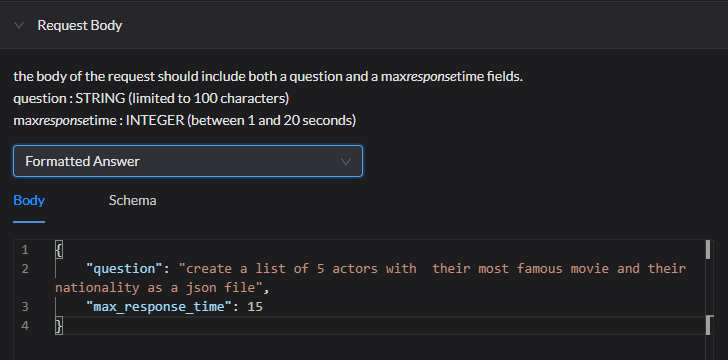 格式化答案选项非常适合生成论文。因此,我们选择它,并将 max_response_time 参数改为 20 秒。这将为 OpenAI 生成答案提供更多时间: