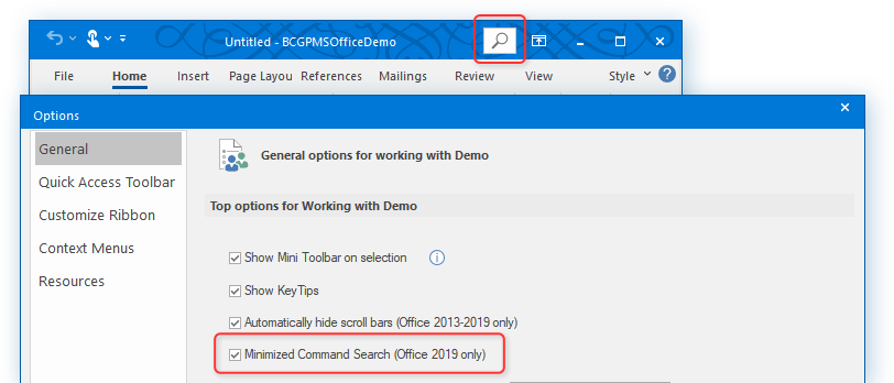 BCGPMSOfficeDemo:添加了命令搜索演示:在 MS Office 2019 主题中,命令搜索出现在功能区标题上并且可以最小化(如在 MS Office 2022 应用程序中)(见屏幕截图)。