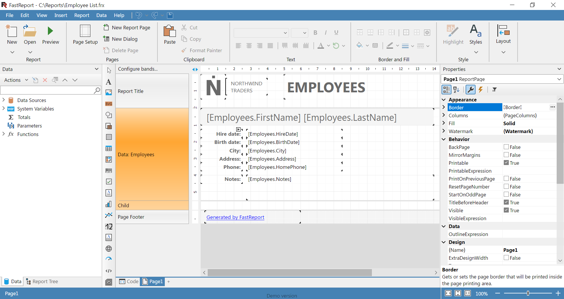 ReportPage 有一个 StartPage 事件,它会在页面渲染之前触发。报告中的每个模板页面都会调用一次该事件。现在,有了一个名为 PageCreate 的新事件,当在准备好的报告中创建页面时会触发该事件。与 StartPage 不同的是,该事件的调用频率更高,每创建一个与模板页面相对应的预制页面就会调用一次。这两个事件都可以指定处理程序,以便执行标准操作之外的其他操作。