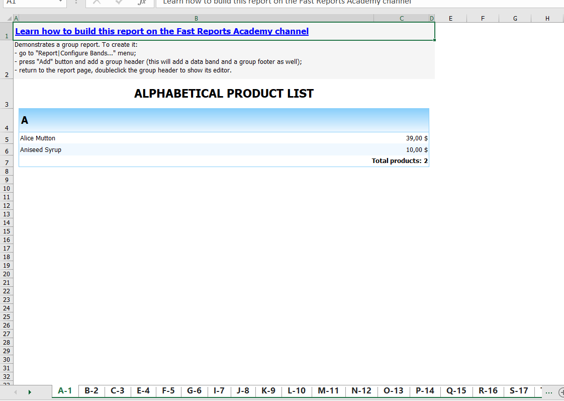 <TextObject Name="Text18" Width="718.2" Height="28.35" Anchor="Top, Left, Right" Fill.Color="WhiteSmoke" Cursor="Hand" Hyperlink.Value="http://fast.report/cda2a" Hyperlink.OpenLinkInNewTab="true" Text="Learn how to build this report on the Fast Reports Academy channel" VertAlign="Center" Font="Tahoma, 10pt, style=Bold, Underline" TextFill.Color="Blue"/>
