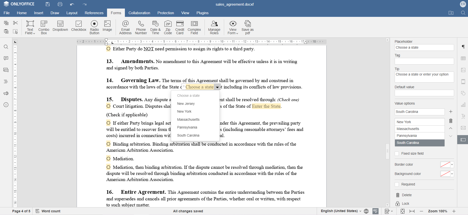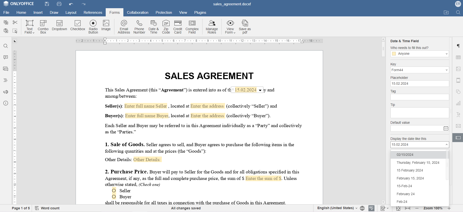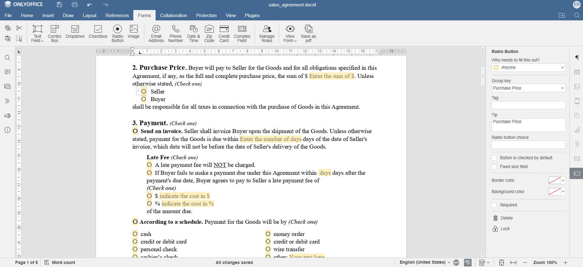 现在,让我们看看如何使用不同类型的可填写字段创建销售协议表单。