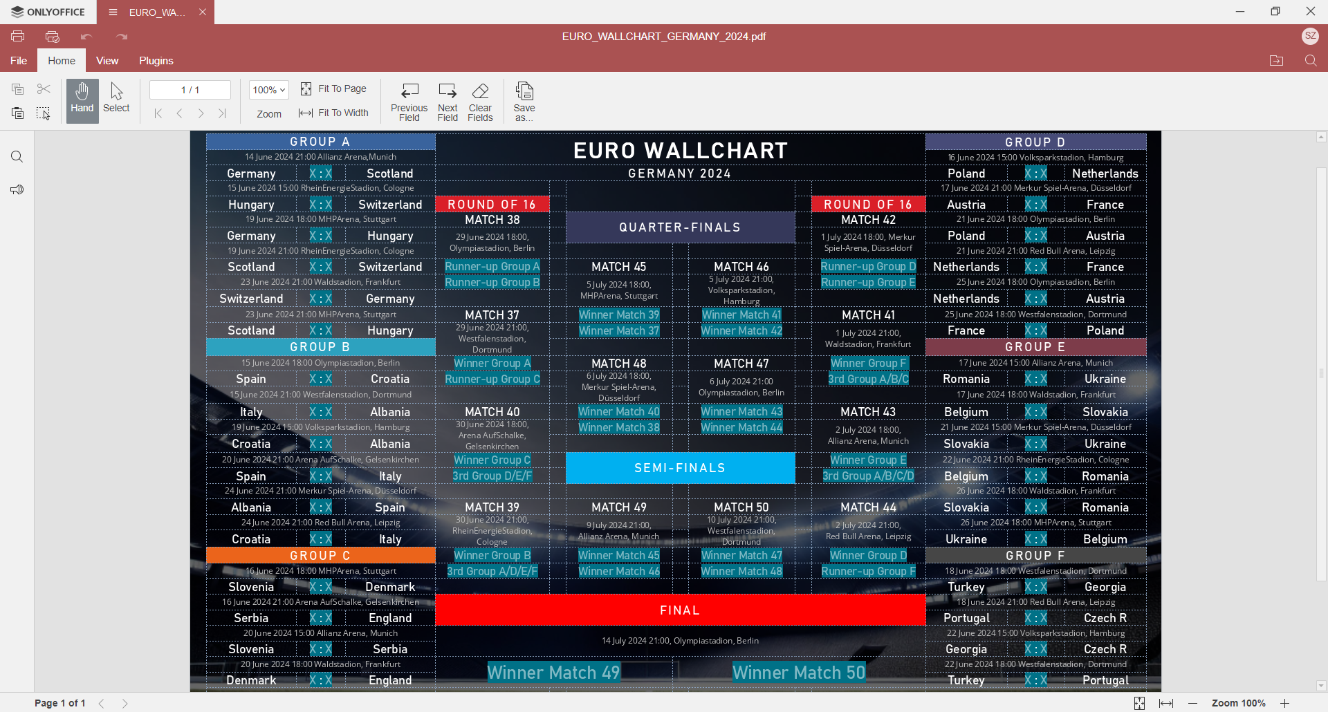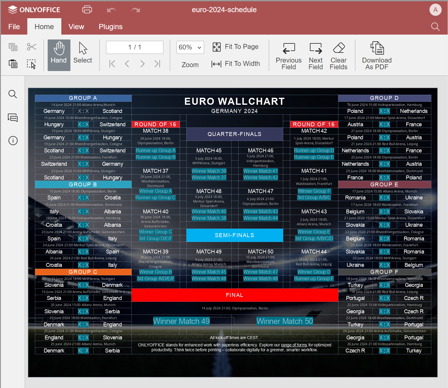 您可以在 ONLYOFFICE 表单库中找到 2024 年欧洲杯分组表。您可以将其下载为 PDF 文件到您的个人电脑或笔记本电脑上。