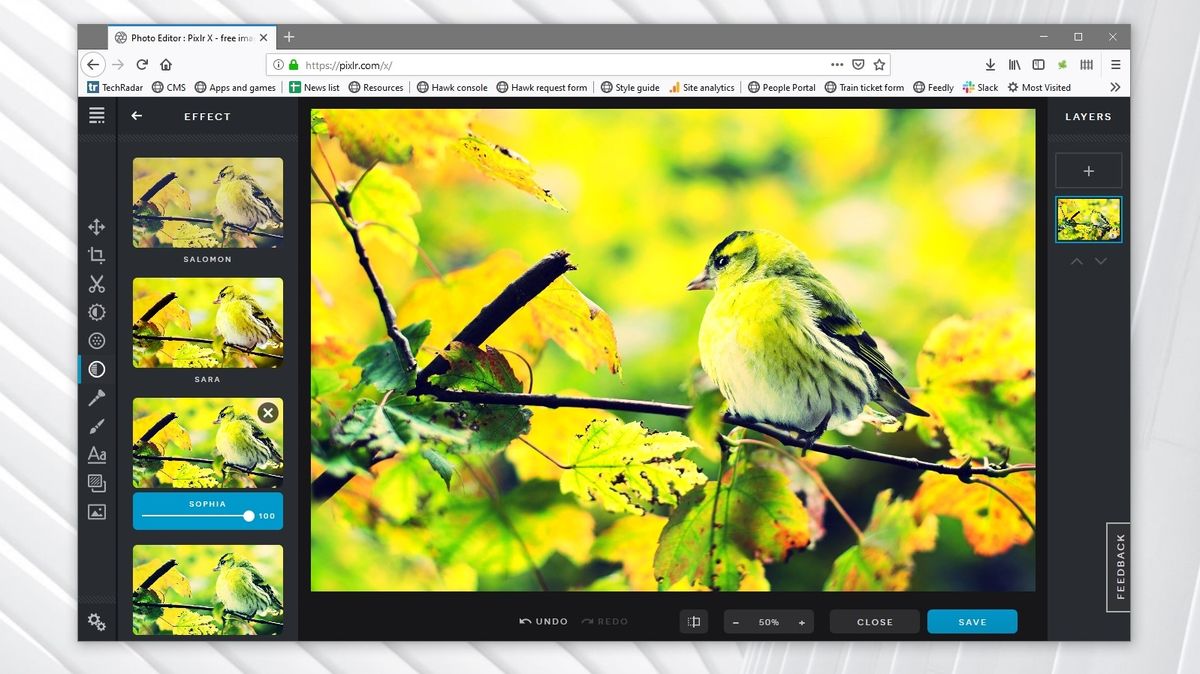 Pixlr 的界面比 Photoshop 或 GIMP 都要简洁,但这并不是一件坏事。工作流程精简直观:你可以从电脑中拖放照片或添加 URL,然后使用熟悉的一键式滤镜和滑块调整图像。
