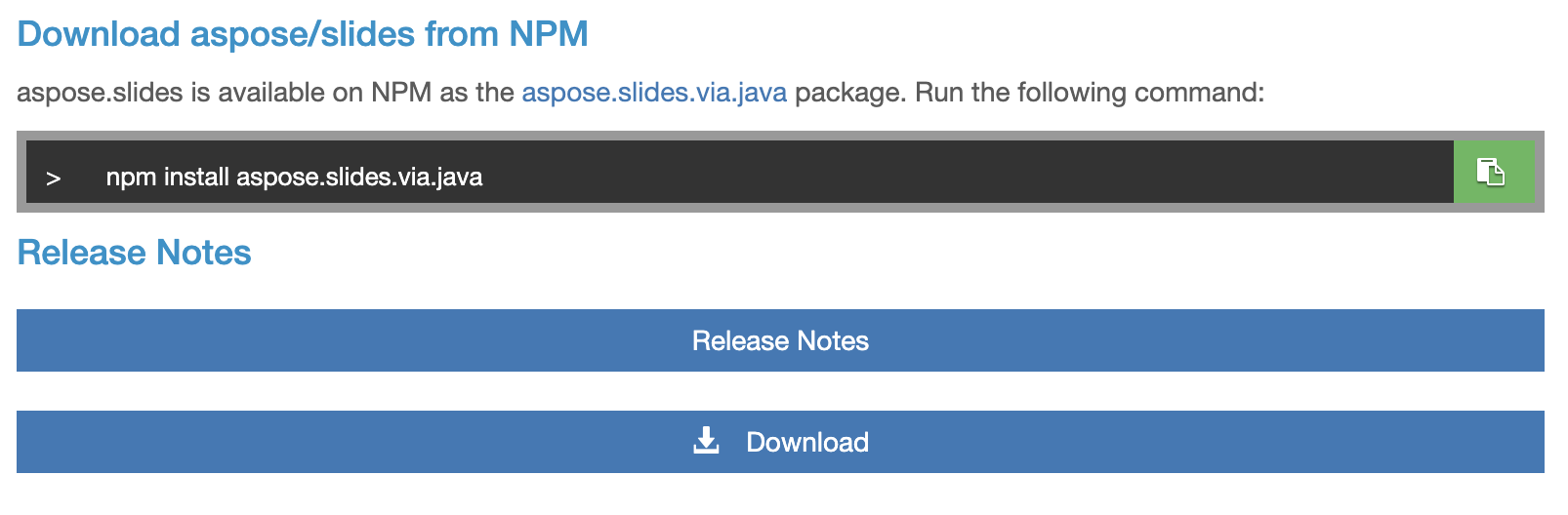 该 PowerPoint JavaScript API 的安装非常简单。此外,它不仅提供转换功能,还能高效地创建和处理 PowerPoint 演示文稿。因此,您可以下载 NPM 软件包,或通过 Java 在终端/CMD 中运行以下命令来安装 Aspose.Slides for Node.js: