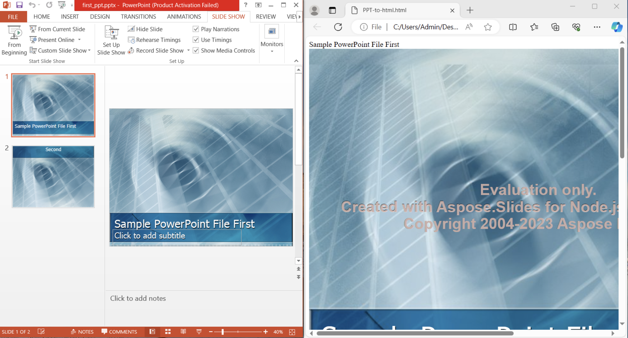 现在,我们将实现如何用 JavaScript 将 PowerPoint 幻灯片转换为 HTML。为此,我们将使用 PPT/PPTX 源文件进行转换。