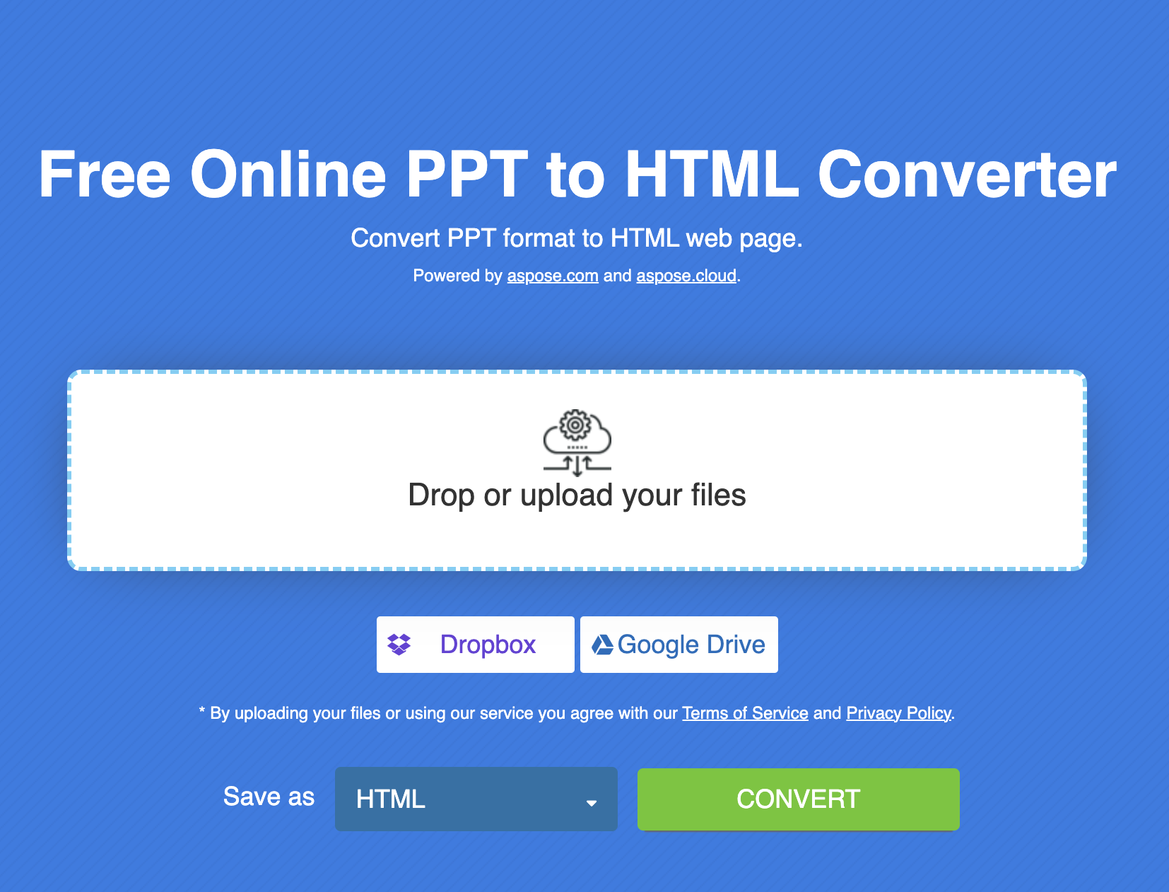 本节将带您了解 Aspose.Slides 通过 Java 为 Node.js 提供的非编程解决方案。该在线 PPT 到 HTML 转换器是一款基于网络的工具,可将 PPT 在线转换为 HTML。此外,它的使用不收取任何费用,您可以通过将文件拖放到用户友好的拖放用户界面来上传文件。一旦文件转换为 HTML,它就会为你提供一个选项,将 HTML 文件的链接发送到你的电子邮件地址。