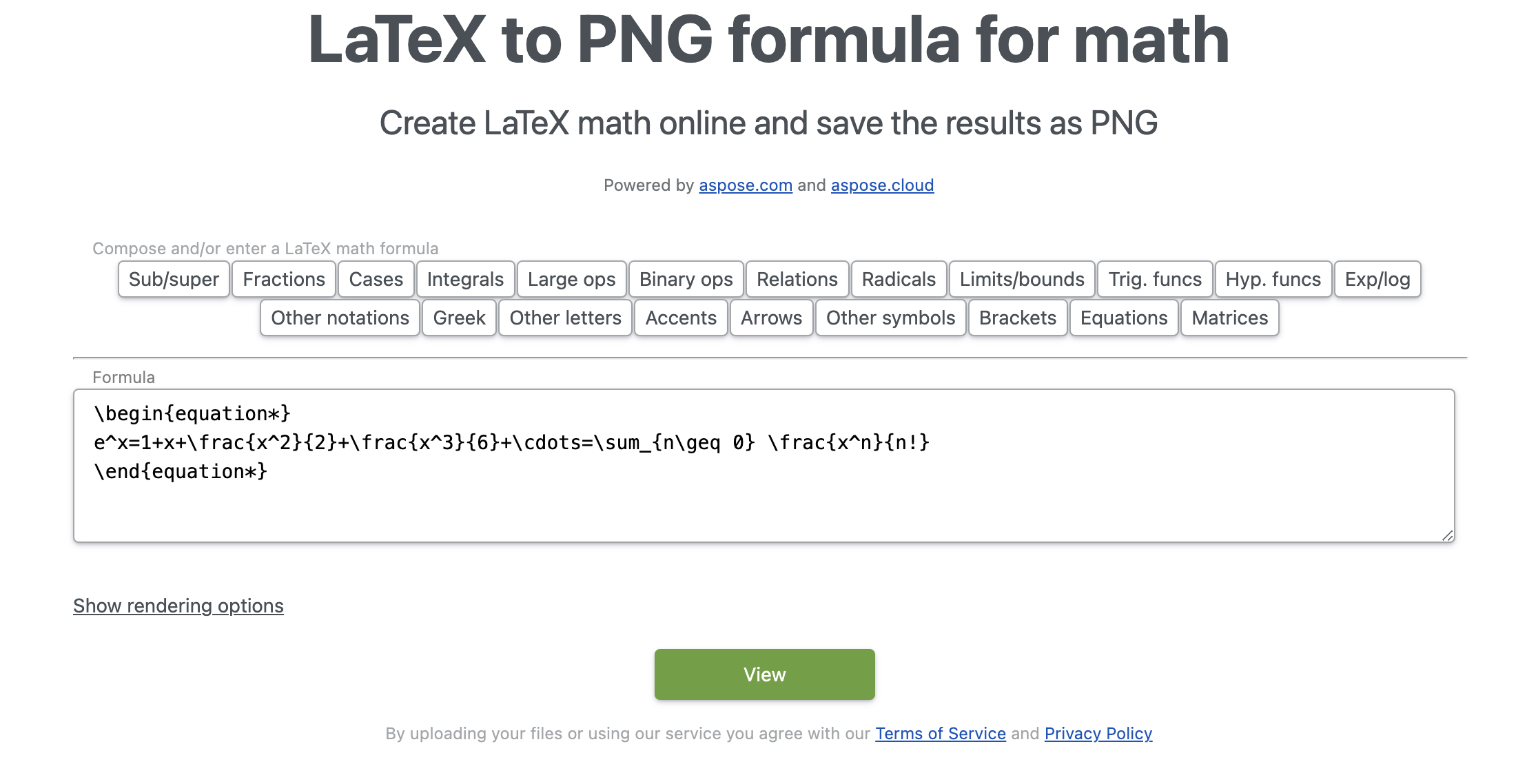 除了将 LaTeX 转换为图像的 API 之外,还有一个 LaTeX 数学公式生成器工具,可在线创建 LaTeX 数学公式。该工具也由 Aspose.TeX 提供支持,具有大量功能。它使用起来超级简单,无需安装,因为它是基于网络的,你可以在任何网络浏览器中打开它。此外,用户界面上还有各种选项,您可以用来创建 LaTeX 数学公式。