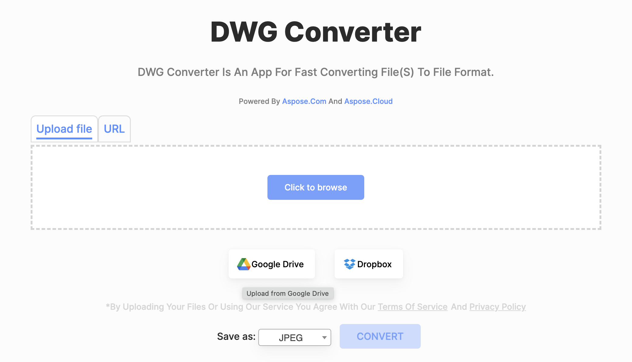 此在线 DWG 到 JPG 转换器由 Aspose.CAD 提供。它提供丰富的无缝转换功能,并可在 24 小时内保留您的文件。此外,它是免费的,无需订阅或创建账户。它有一个合理而简单的界面,你可以拖放文件。该工具是由 Aspose 顶级工程师设计的强大高效服务器的前端。