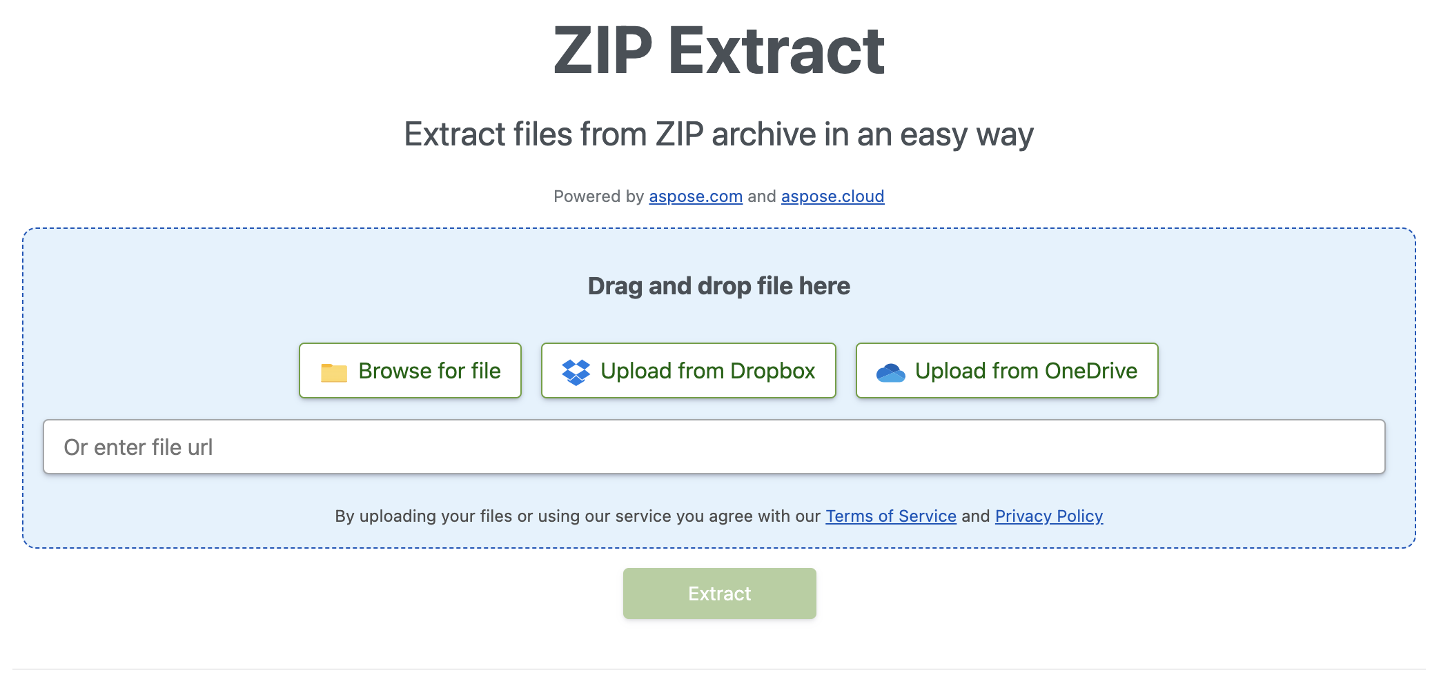 }同样,这款在线 ZIP 提取器也由 Aspose.ZIP 提供支持。这款企业级工具拥有优雅的用户界面,可通过多种方式上传文件。同样,它也是免费的,无需创建账户。