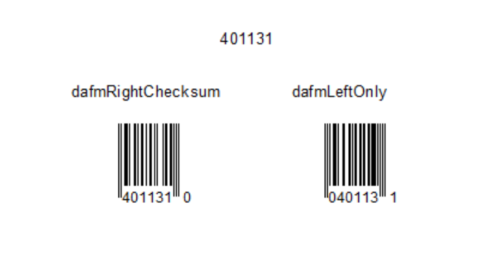 dafmLeftOnly fill missing barcode digits with zero from left side.添加了一个线性条形码的新属性--DigitsAutoFillMode。 dafmRightChecksum总是在条形码标准要求的数字不足时添加一个零校验和。