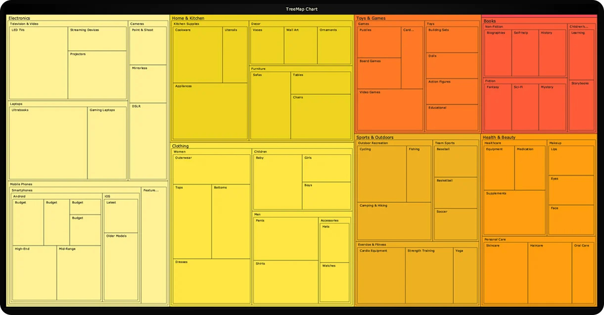 树状地图图表现在可供所有已激活订阅的用户使用。这种类型的图表允许用户在嵌套的矩形内可视化分层数据,这些矩形根据大小代表较大或较小的值。树状地图图表具有内置的向下钻取功能,允许用户显示更多深度数据。查看所有可用的树状地图图表。