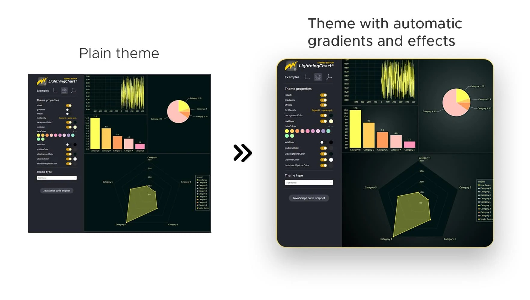 现在,使用 LCJS 主题生成器创建的所有主题都支持自动渐变和特效,可为您的数据应用程序带来更震撼的外观和感觉。