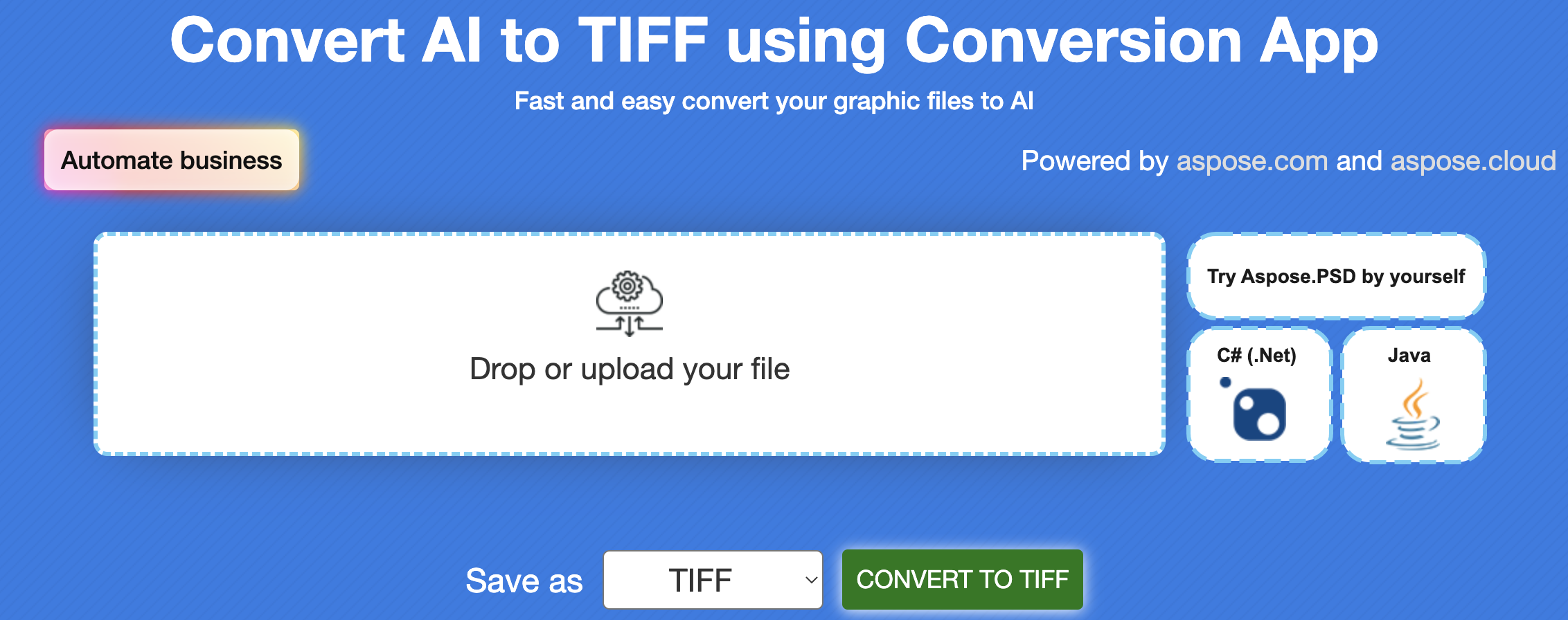 除了程序解决方案,Aspose.PSD for Java 还支持功能强大的 Adobe Illustrator 在线文件转换器。此外,它运行流畅,转换精确。此外,这款 AI 转 TIFF 转换器使用方便,无需创建账户即可使用。