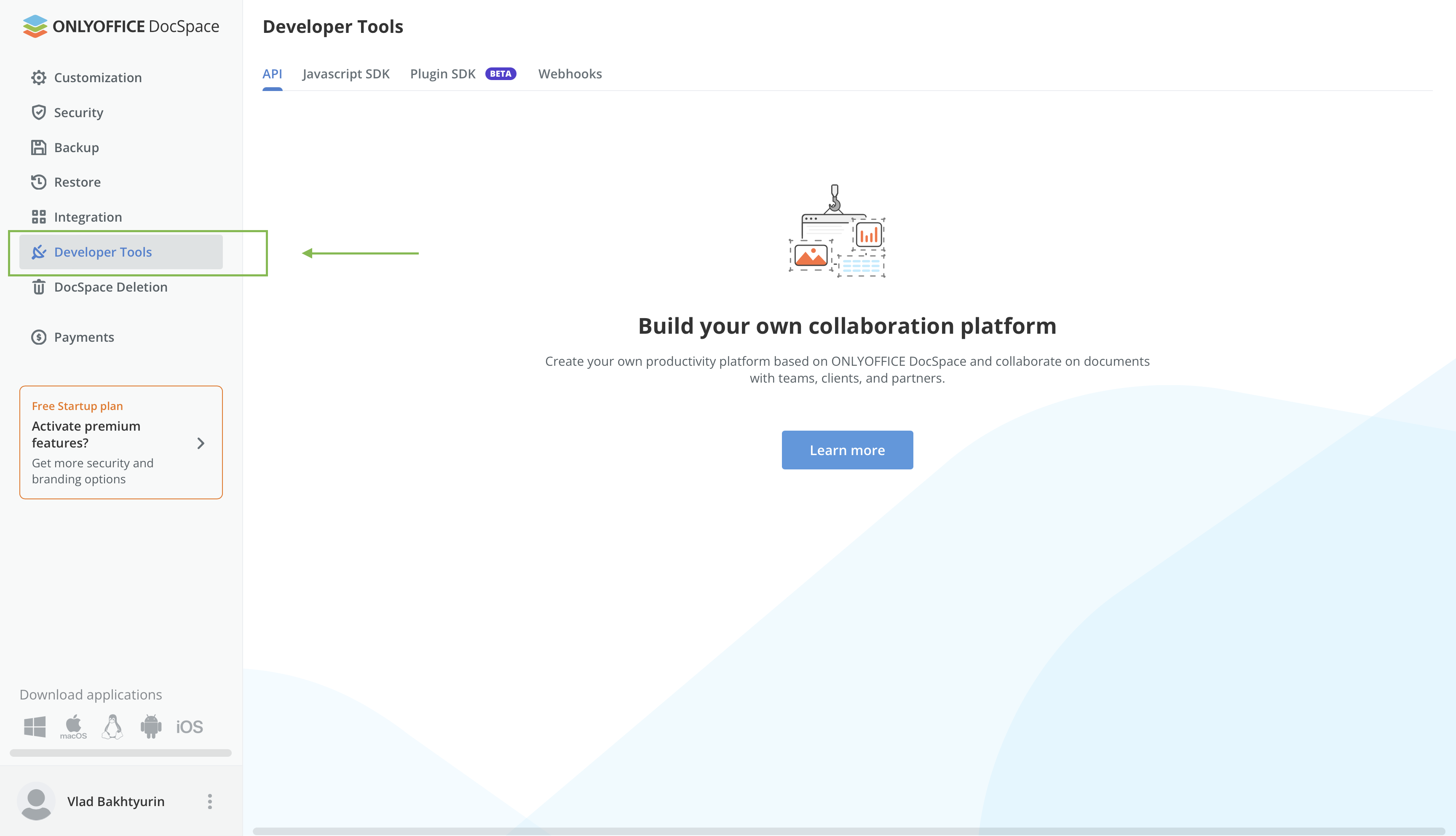 第 1 步在你的 DocSpace 主屏幕上,点击你名字旁边的三个点,进入 DocSpace 设置。