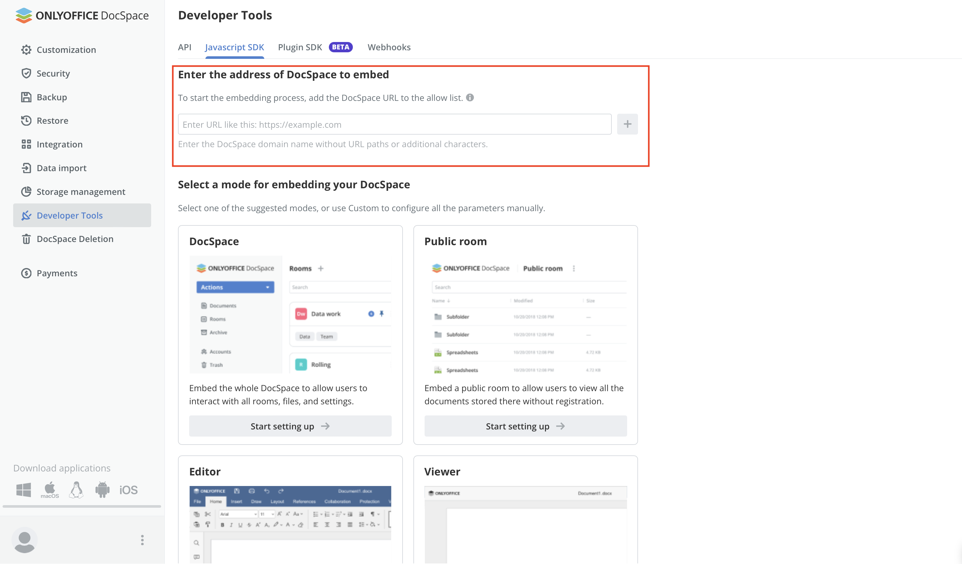 ONLYOFFICE DocSpace 提供了多个嵌入选项,并附有简短说明,以便您对每个选项有所了解。