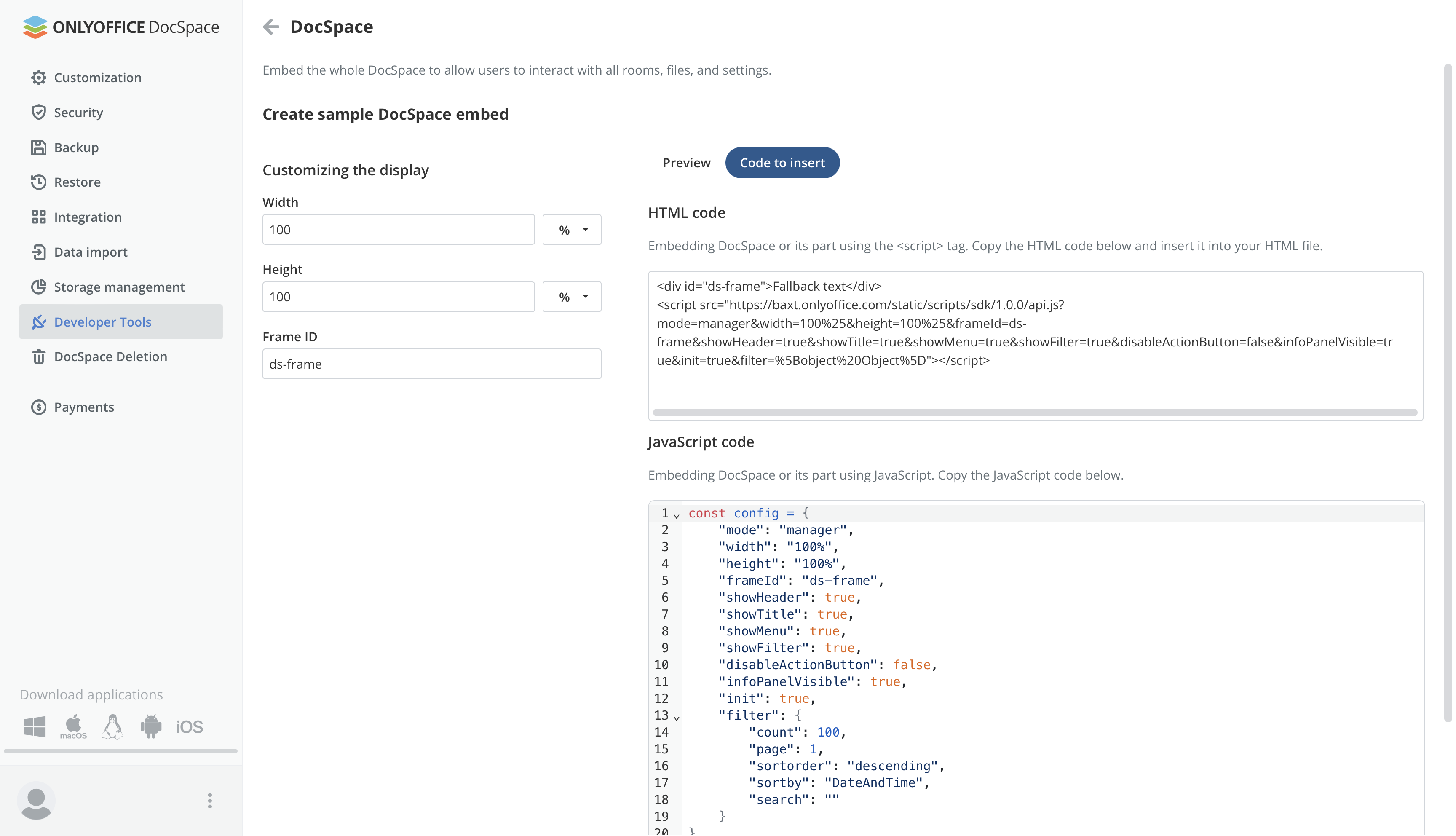 选择所需的 DocSpace 嵌入预设后,最后一步是打开 "代码插入 "选项卡,将其复制并粘贴到网站的 index.html 文件中。