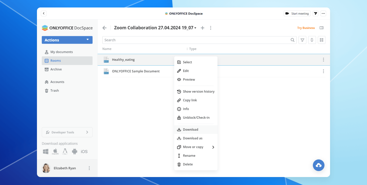 为了更有效地管理文件,现在可以通过浏览器从 DocSpace 下载文件。具体操作如下