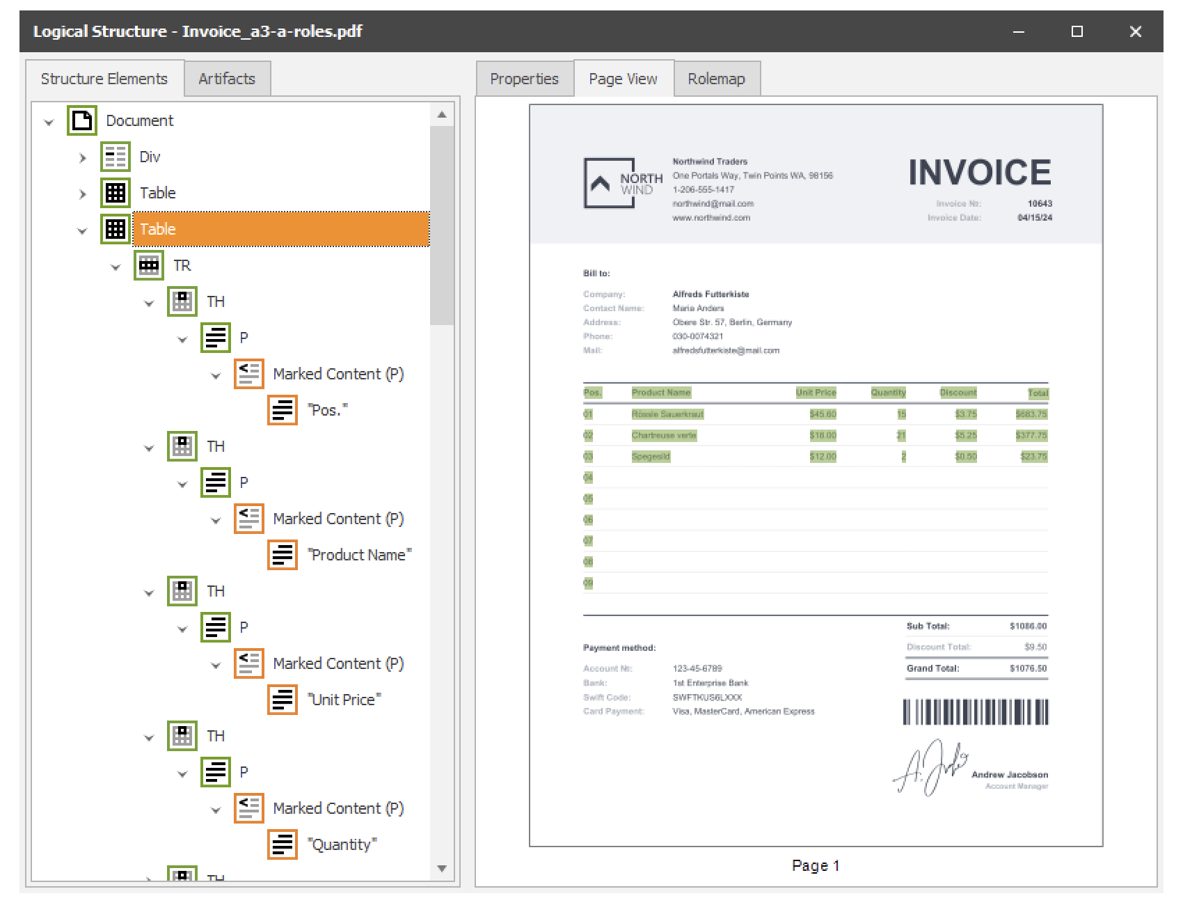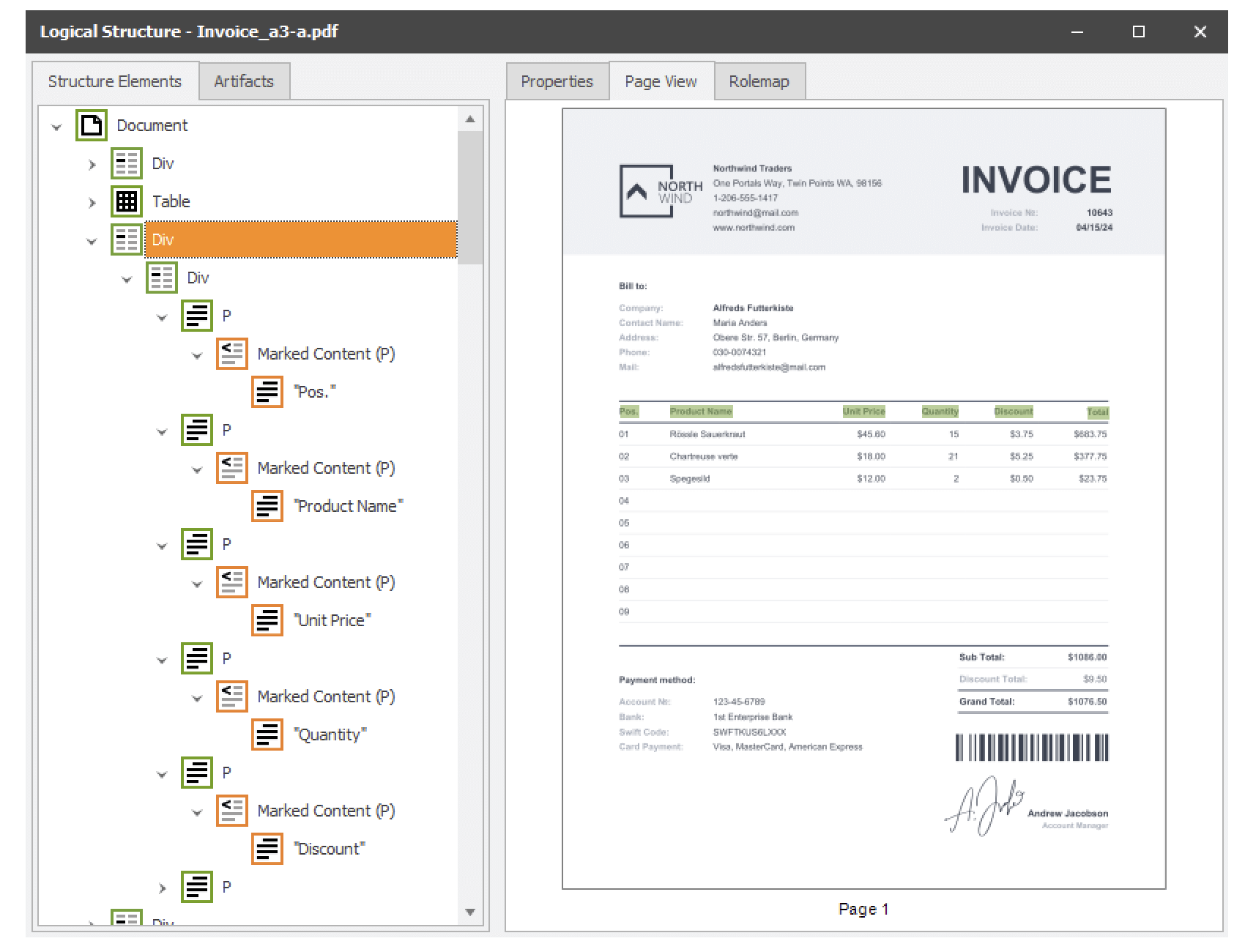 请看一份满是表格的发票报告。当您将报告导出为 PDF (ua/a-1a)时,所有元素都被标记为 <div>,这并不能让人清楚地了解文档元素的结构以及与之相关的数据: