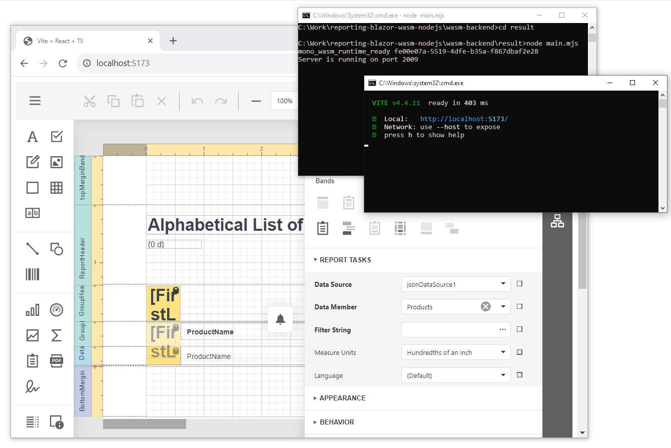 GitHub 上的 DevExpress 示例库中有完整的示例项目: Reporting for Web - 在 WebAssembly 应用程序中使用 .NET 与 Node.js 集成创建报表。